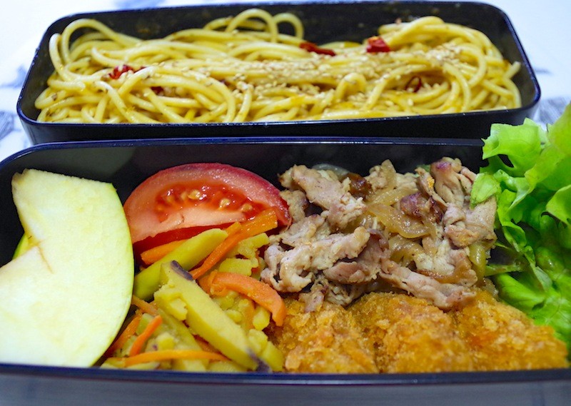 高菜のスパゲティ、リーフレタス、玉ねぎと豚肉の炒め物、メンチカツ