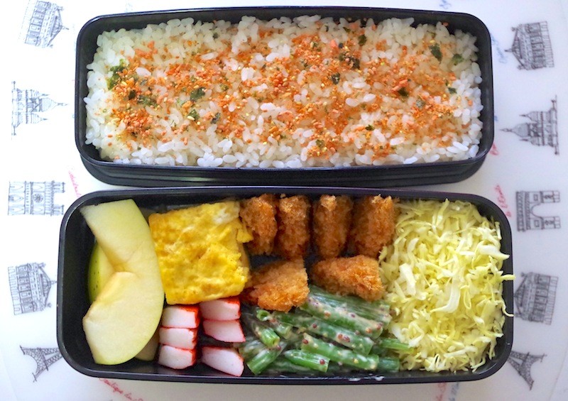いんげん豆の辛子マヨネーズ和え、玉子焼き、カニ蒲鉾、王林