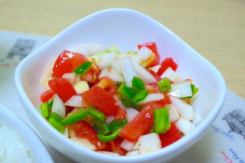 玉ねぎ・トマト・ピーマンをお酢で和えたサラダ、ヴィナグレッチ。