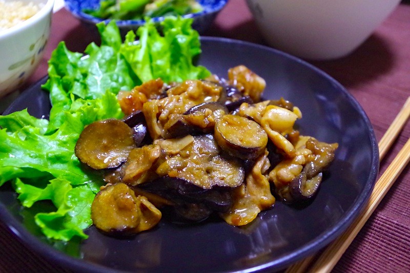玄米、豚バラ肉と茄子の甘味噌炒め、ツルムラサキの和え物、キャベツ等のサラダ