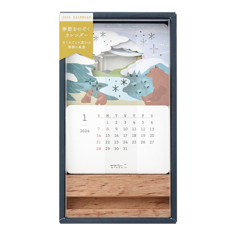紙製ボックス入りでギフトにもおすすめです。●寸法:パッケージサイズ/H204mmW119mmD21mm本体サイズ/H156mmW100mmD40mm●掲載期間:2024年1月〜2024年12月●素材:紙製●枚数:12枚●罫内容:卓上/卓上