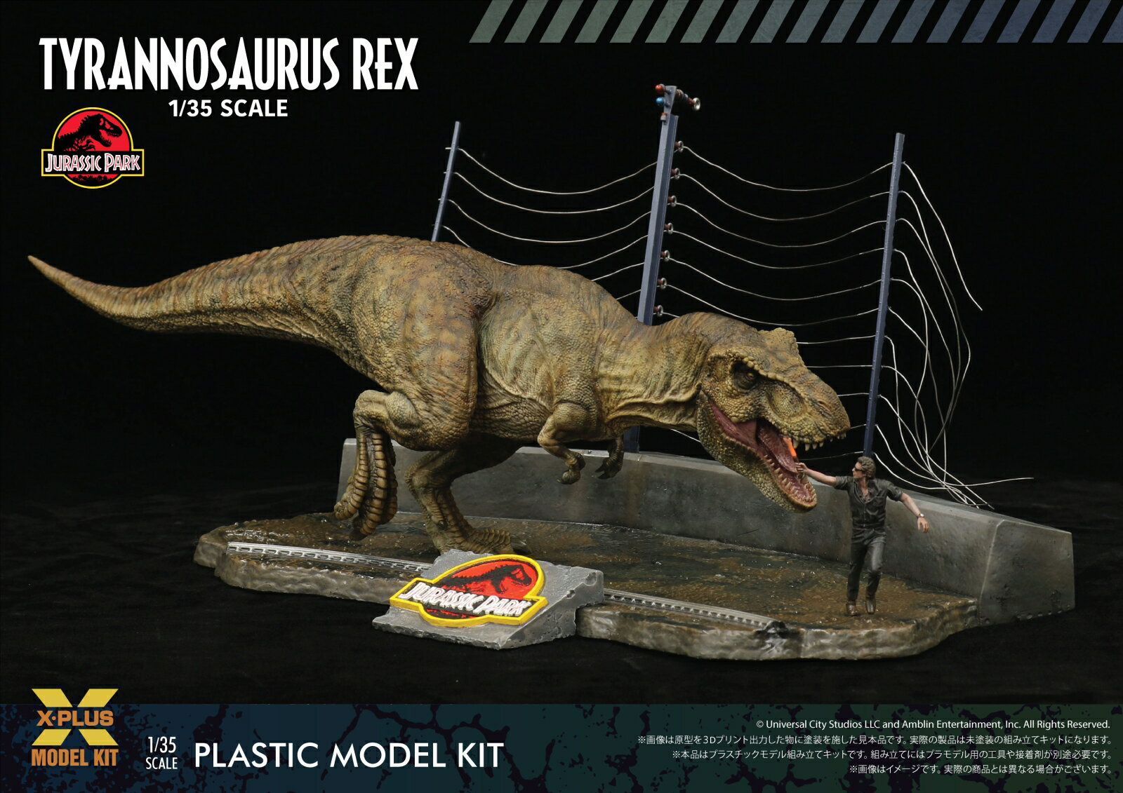 1993年公開の映画『ジュラシック・パーク』に登場するT-レックス。地響きと共に姿を現し、メインロードを訪れたツアー参加者を恐怖に陥れるシーンは、息をのみ瞬きを忘れ“本物の恐竜”を目の当たりにした瞬間でした。初めて見た時に感じた興奮や迫力をプラスチックモデルキットでお届けします。