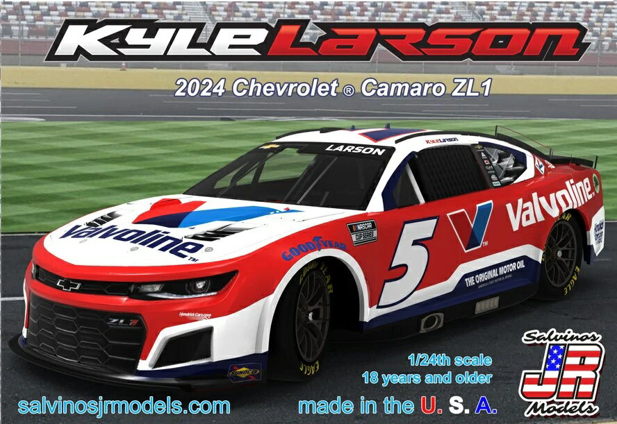 モデルは2024年NASCARに参戦するカイル・ラーソンがドライブするシボレー カマロをサルビノス・モデルがオリジナル金型で再現した1/24スケールのプラスチックモデル組み立てキットです。
