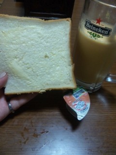 マンゴー味シェイク、蒟蒻畑白桃味、食パン6枚切りを1枚。