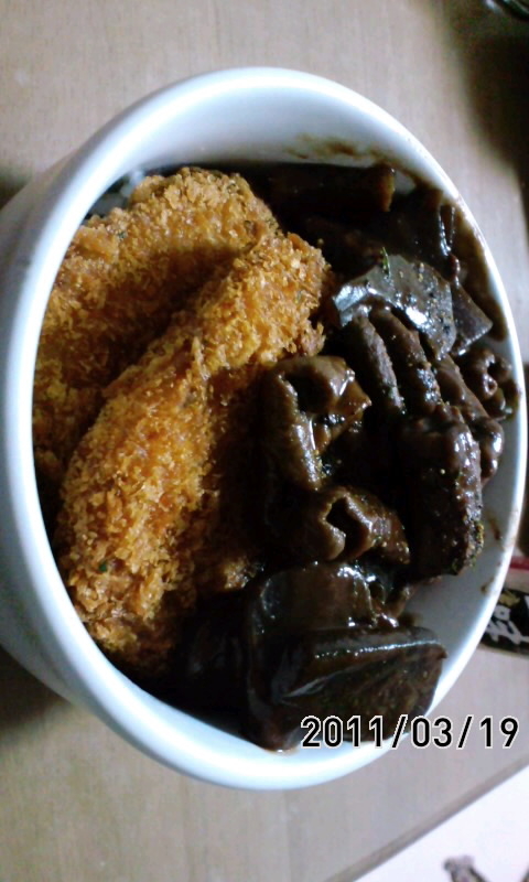 昨日作った土手煮(豚ホルモン、蒟蒻、大根を味噌味で煮たもの)とコロッケ(スーパーで18円)をご飯に乗せただけ…って書いてて罪悪感が襲ってきたけど美味しかったです。甘辛味噌とコロッケは合うよ!
