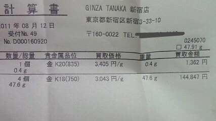 最近金が値上がりしていたので、小遣い稼ぎに売りに行く事にした。