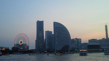夕暮れせまる6:20頃、象の鼻桟橋から花火観賞の船が出る。