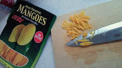 でも!オヤツのドライマンゴーがあったので細かく刻んで入れてみました。