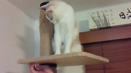 キャットタワーの上からジーッと見詰めているので「遊んで欲しいのか?」と思い