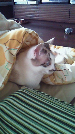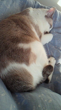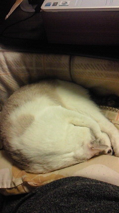 やっと顔を上げたけど、胸の白い毛が光で白トビ起した画像に。(´゚ω゚`)