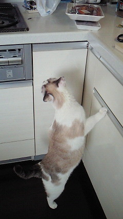 キッチンの上が気になるが私が居るから、クンクンするだけで我慢…。