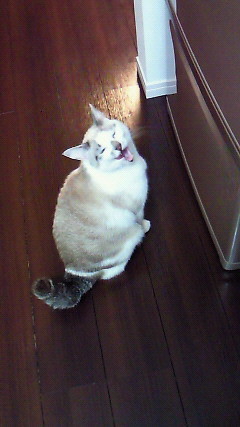 食後に顔の周りを前脚でテキトーに拭いてるブルー。