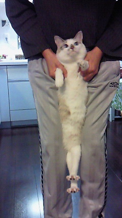 ダンナの足元をウロウロして、グイッと持ち上げられ腿にホールドされる。