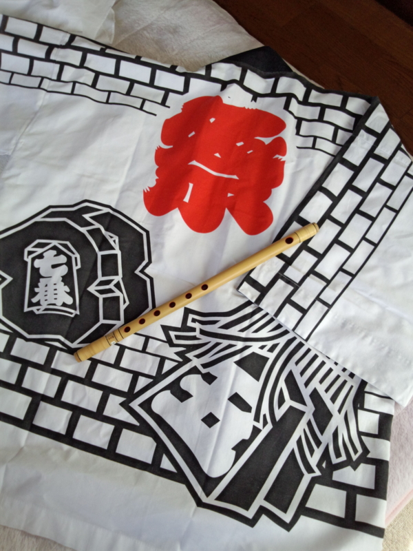 子ども屋台で息子は笛を吹きますが 子ども用法被では小さいので大人用を借りてきたのですが