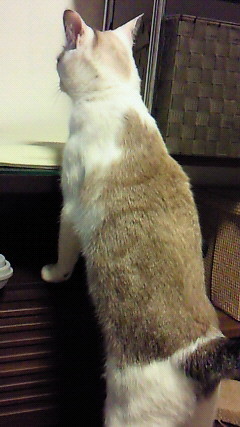 テレビボードの左端にフッと立ち上がった。 上に乗るのかと思ったら…