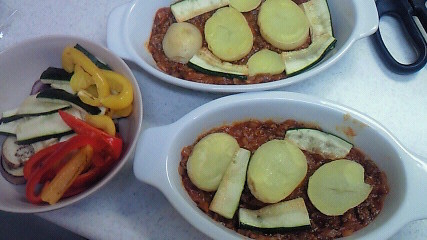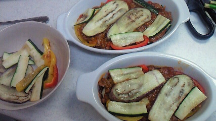 グラタン皿にミートソース→野菜と層にして載せていく。