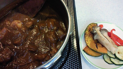 ルーを入れて軽く煮る。トッピングの焼き野菜も載せてみた。