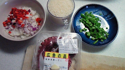 2人分:玉ネギ・パプリカ・ピーマン・ニンニク・タコ・チキンコンソメ・米1合で
