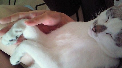 …でも叱られるのが怖いのか、ビビリながら怖々前足出してるのだよねぇー。(^p^)