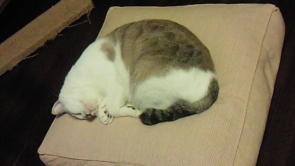 夜中、クッションの上でしっかりと寝てるように見える猫。