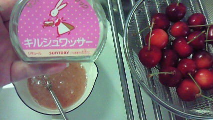 煮溶かしたパウダー寒天に砂糖、キルシュワッサー(サクランボ酒)を入れて