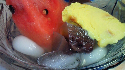 シロップに入れてスイカやアイスを載せてみた。