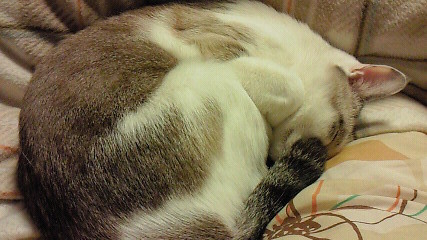 私の腿の上のコタツ布団で、ズシリと重みを掛けながら眠る猫…(´・ω・`)