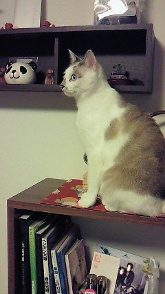 夜、キャットタワーの半端な位置からジーッと見つめてくるので…