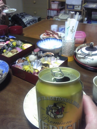 実家でおせちをつまみながら母がケース買いしてくれていたヱビスビールをいただきます。
