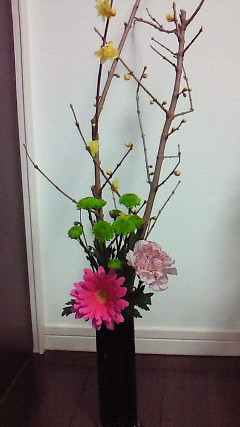 蝋梅と千両が高いので、安めのスプレー菊やカーネーションにしたけど