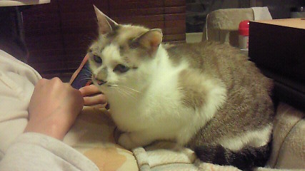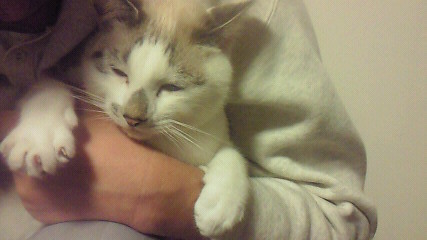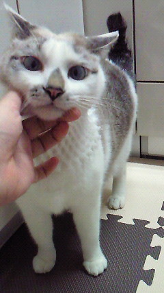 オモチャで遊んで貰えるかと近付いて捕獲された。イラッとしてるね…(^p^)