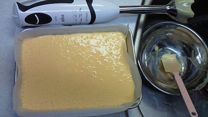 右の薄力粉入り溶かしバターにコンソメ牛乳を少しだけ(100cc)入れ混ぜる。