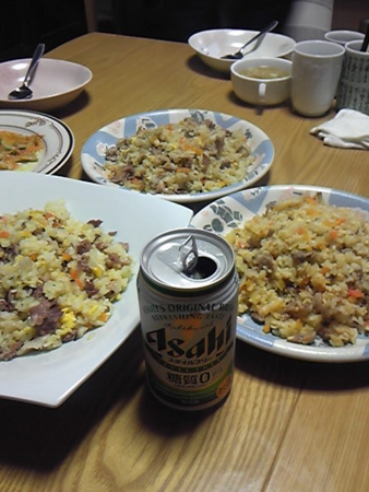 チャーハンを三人分作るのに三種類の味にして取り分けるようにしました。