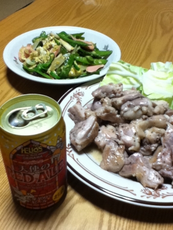 鶏肉のレモンペッパー焼きとサーヤチャンプルをおかずに天使のレッドエールをいただきます。