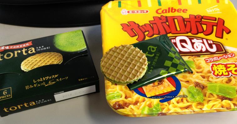 Asahiのオランダワッフル風抹茶味菓子。昨日はスルーしましたが好奇心が勝って夕飯にサッポロポテトバーベQ味焼きそばも買いました。
