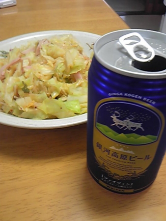 キャベツメインの焼きビーフンキムチ味をおかずに銀河高原ヴァイツェンをいただきます。