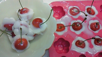 去年はサクランボ果汁ゼリーへサクランボを入れたけど、今年は寒天にした。