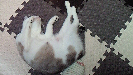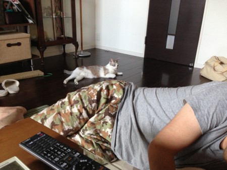 節電でエアコンがついていないと…ゴロゴロしてる姿がダンナとシンクロ。(^p^)