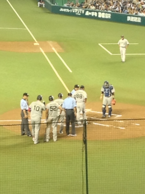 代打もヘルメットにあたったのに審判四人話しあったがファールの判定