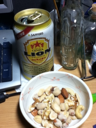 ミックスナッツをツマミにサッポロ 銀座ライオン プレミアムをいただきます。