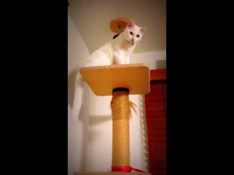 キャットタワーの上でネズミ待ち。右手に竿、左手のiPhoneで撮影してみた。