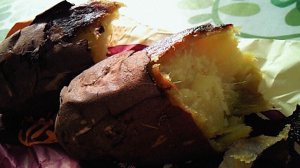 昨日買って忘れていた焼き芋をレンジで温めて半分コに。(午前中)( ´∀`)゚