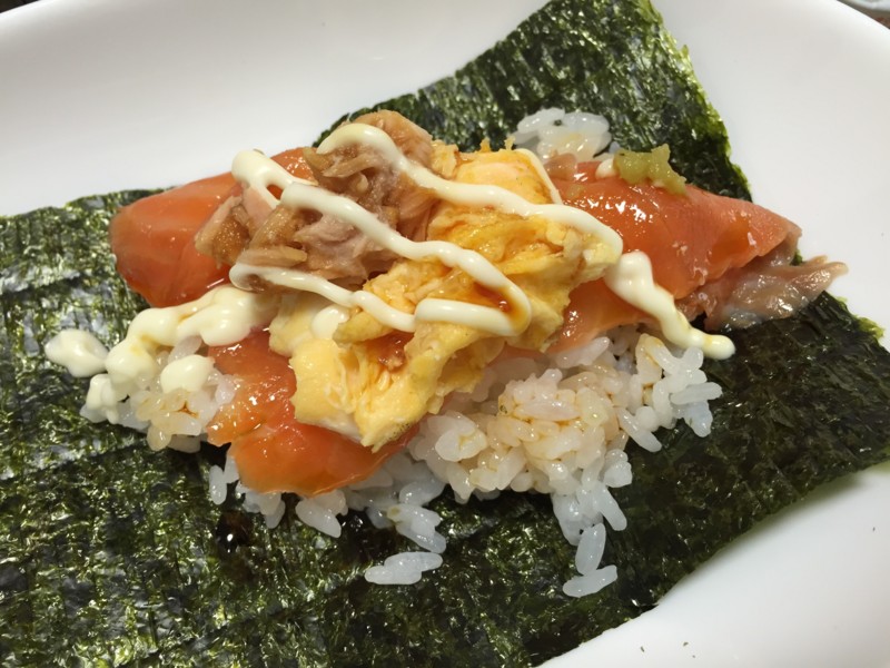 好きなものをテキトーに乗っけてわさびちょっと付けて醤油たらして巻いて食うよ。うまうま。