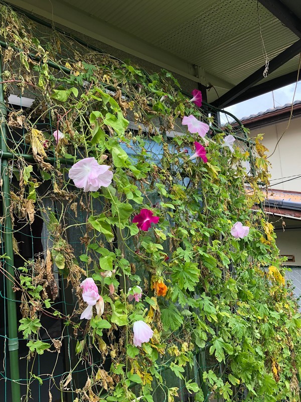 ゴーヤは枯れてきているのに、アサガオの方はこれからが本番のように咲いている。