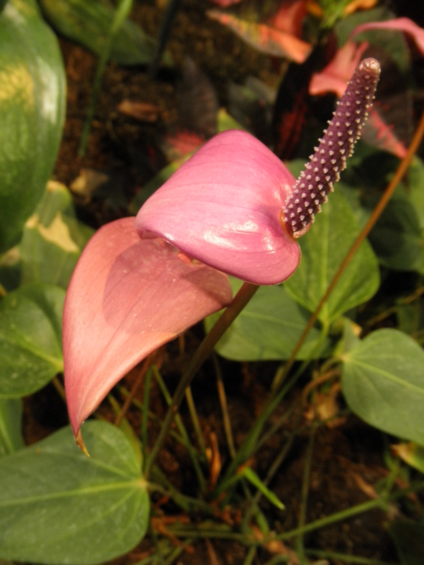 アンスリウム「チューリップパープル」。艶やかで厚みのある苞が、蘭の花のような艶めかしい魅力を感じます。
