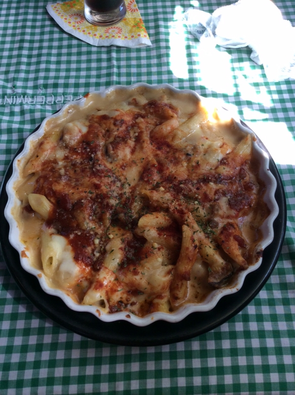 ランチの牡蠣、海老、帆立入りペンネグラタンセット@サラダ、スープ、ドリンク付き