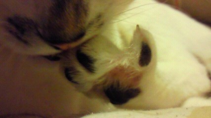 【猫の足】 人の膝の上でどっしり寛ぎ中「お手して」( ´ー`) にゃー 肉球の間に親指をズボッ! \ 何かくすぐったいにゃ…/ 足の裏側を舐める 一度くすぐったく感じたせいか、何だか後ろ足も舐め始めたよ。