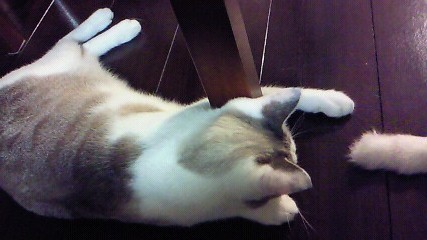 3.階下に行き、オモチャ(猫じゃらしの頭だけ)を持って来てベッドの周囲で遊ぶ。