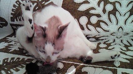 2.枕元に上がりジーっと見詰め、人の顔を(鼻の頭)をザラッと舐める。
