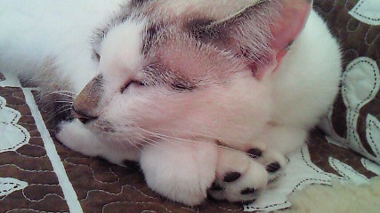【脚の寄せ方】(その解説) / 今日は皆さんに解りやすい4本足枕をお見せしますニャ!\ 1.先ずは最初に後ろ足を頭の方へビヨーン!と伸ばして… 2その上へ.前足をXにして、アゴを乗せる。 / そうすると、ちょーどイイ高さの枕が出来るのにゃ…\ Zzz (o>艸<) ネチャッタ!